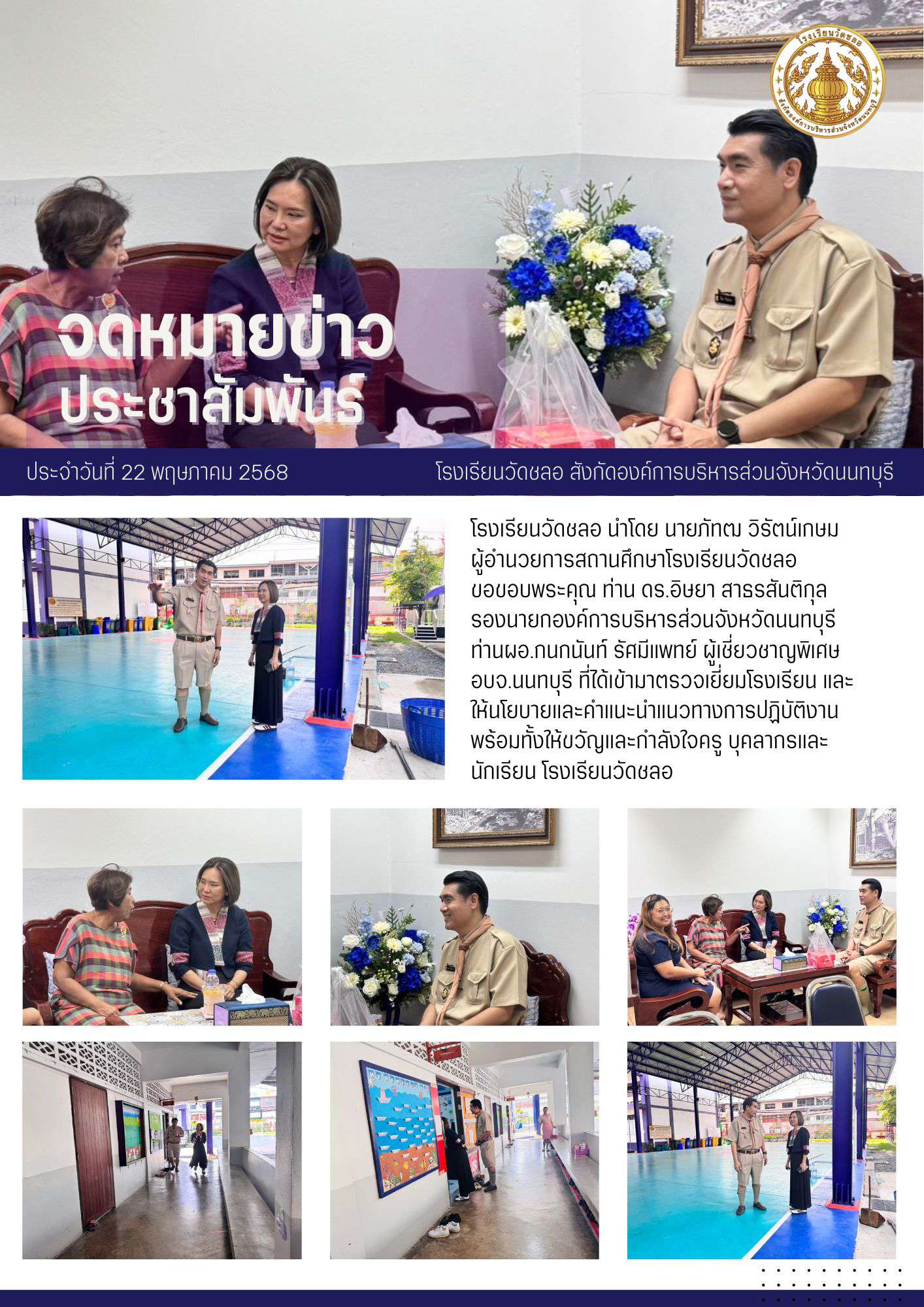 ท่านผอ.กนกนันท์ รัศมีแพทย์ ผู้เชี่ยวชาญพิเศษ อบจ.นนทบุรี ที่ได้เข้ามาตรวจเยี่ยมโรงเรียน และให้นโยบายและคำแนะนำแนวทางการปฏิบัติงาน พร้อมทั้งให้ขวัญและกำลังใจครู บุคลากรและนักเรียน โรงเรียนวัดชลอ