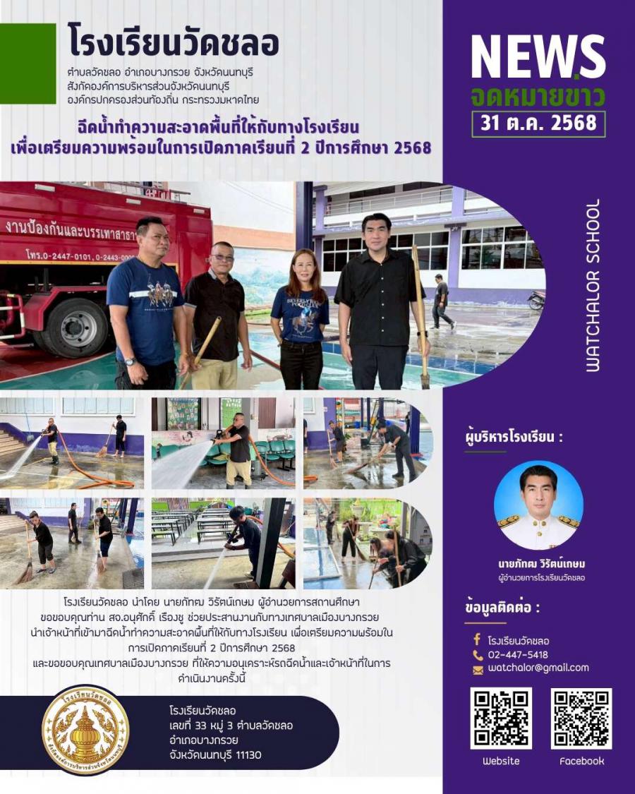 ฉีดน้ำทำความสะอาดพื้นที่โรงเรียน เพื่อเตรียมความพร้อมในการเปิดภาคเรียนที่ 2/2568