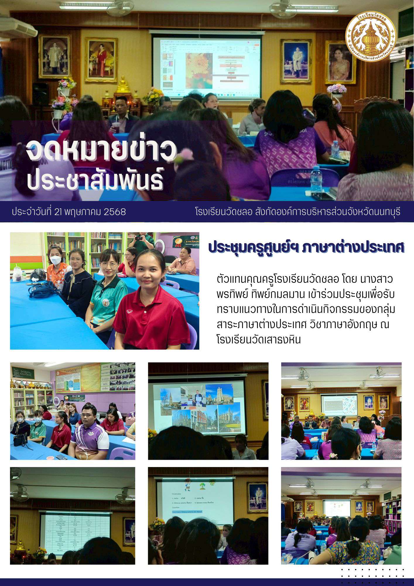 ตัวแทนคุณครูโรงเรียนวัดชลอ โดย นางสาวพรทิพย์ ทิพย์กมลมาน เข้าร่วมประชุมเพื่อรับทราบแนวทางในการดำเนินกิจกรรมของกลุ่มสาระภาษาต่างประเทศ วิชาภาษาอังกฤษ ณ โรงเรียนวัดเสาธงหิน