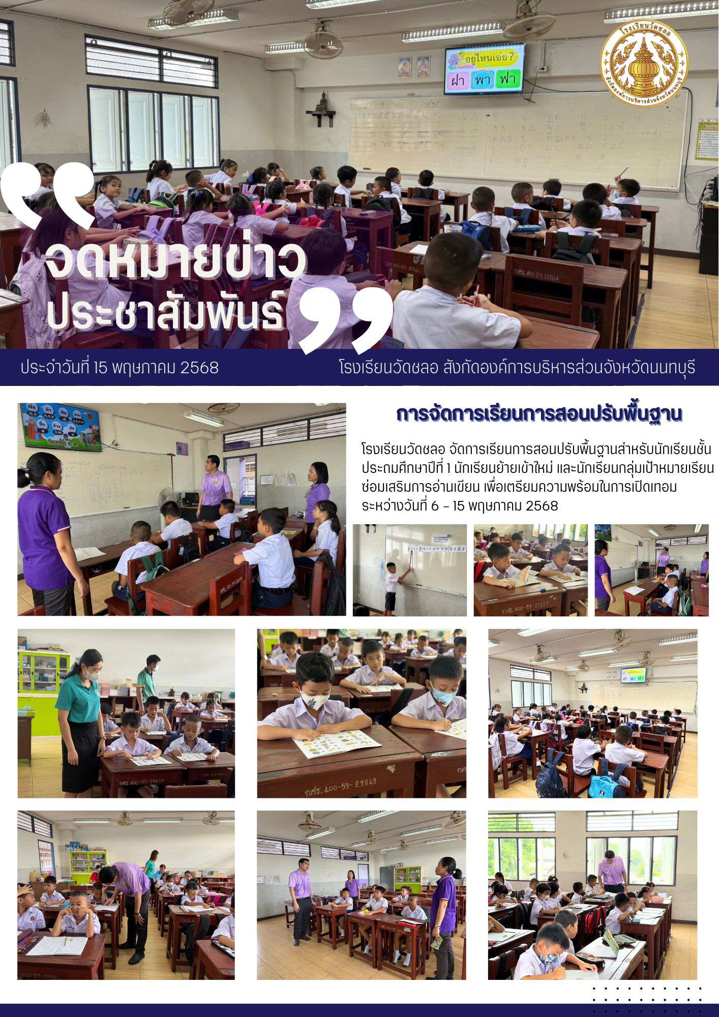 โรงเรียนวัดชลอ จัดการเรียนการสอนปรับพื้นฐานสำหรับนักเรียนชั้นประถมศึกษาปีที่ 1 นักเรียนย้ายเข้าใหม่ และนักเรียนกลุ่มเป้าหมายเรียนซ่อมเสริมการอ่านเขียน เพื่อเตรียมความพร้อมในการเปิดเทอม ระหว่างวันที่ 6 - 15 พฤษภาคม 2568