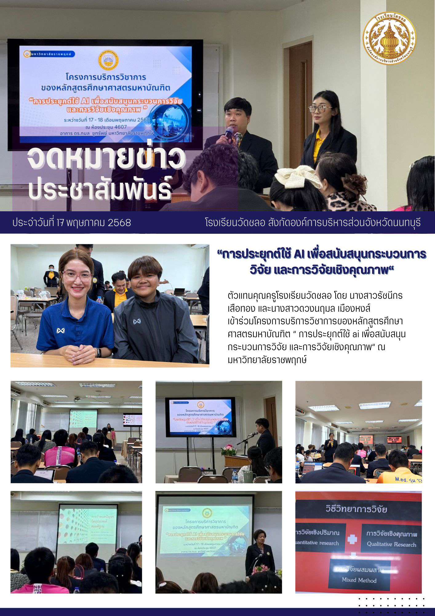 ตัวแทนคุณครูโรงเรียนวัดชลอ โดย นางสาวรัชนีกร เสือทอง และนางสาวดวงนฤมล เมืองหงส์ เข้าร่วมโครงการบริการวิชาการของหลักสูตรศึกษาศาสตรมหาบัณฑิต “ การประยุกต์ใช้ ai เพื่อสนับสนุนกระบวนการวิจัย และการวิจัยเชิงคุณภาพ“ ณ มหาวิทยาลัยราชพฤกษ์