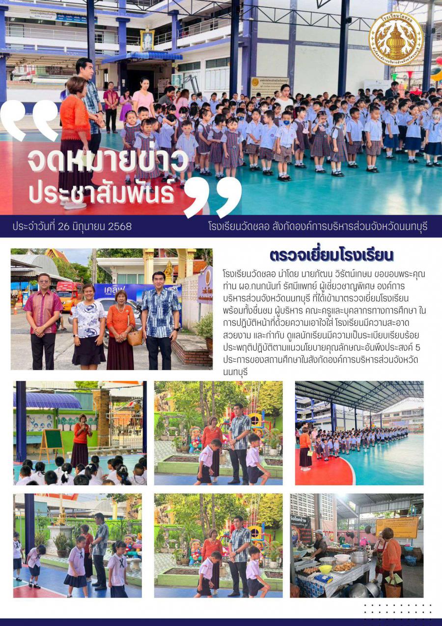 โรงเรียนวัดชลอ นำโดย นายภัฒน วิรัตน์เกษม ขอขอบพระคุณ ท่าน ผอ.กนกนันท์ รัศมีแพทย์ ผู้เชี่ยวชาญพิเศษ องค์การบริหารส่วนจังหวัดนนทบุรี ที่ได้เข้ามาตรวจเยี่ยมโรงเรียนพร้อมทั้งชื่นชม ผู้บริหาร คณะครูและบุคลากรทางการศึกษา ในการปฏิบัติหน้าที่ด้วยความเอาใจใส่ โรงเรียนมีความสะอาด สวยงาม และกำกับ ดูแลนักเรียนมีความเป็นระเบียบเรียบร้อย ประพฤติปฏิบัติตามแนวนโยบายคุณลักษณะอันพึงประสงค์ 5 ประการของสถานศึกษาในสังกัดองค์การบริหารส่วนจังหวัดนนทบุรี